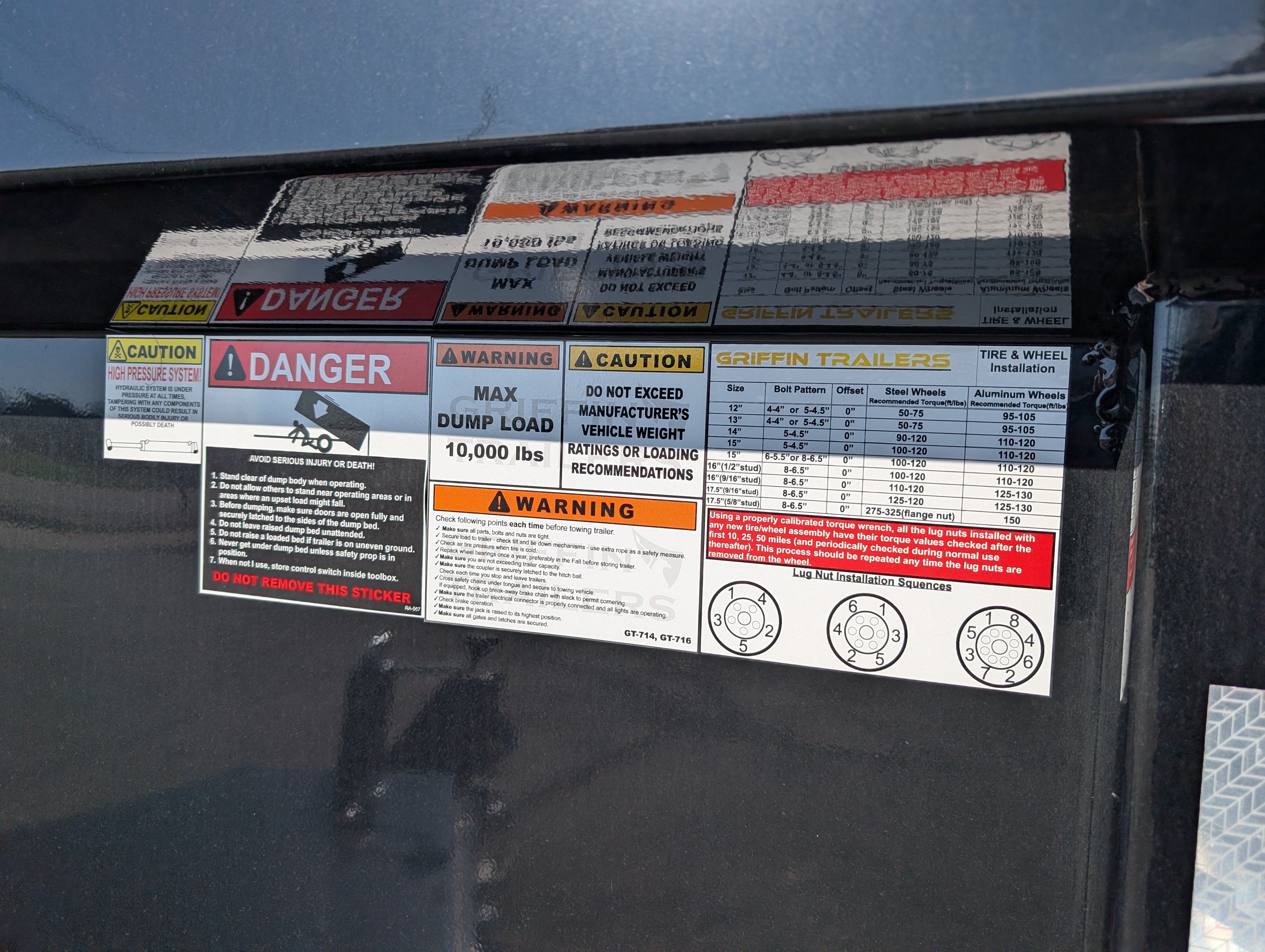Griffin dump trailers are built in the USA with heavy-gauge steel, commercial-grade hydraulics, and powder-coat finishes. Every model includes barn-style rear doors, D-ring tie-downs, electric brakes, LED lighting, fender-mounted ramps, spare tire mount, and a 12V battery-powered hydraulic system. Griffin backs their trailers with a manufacturer warranty.