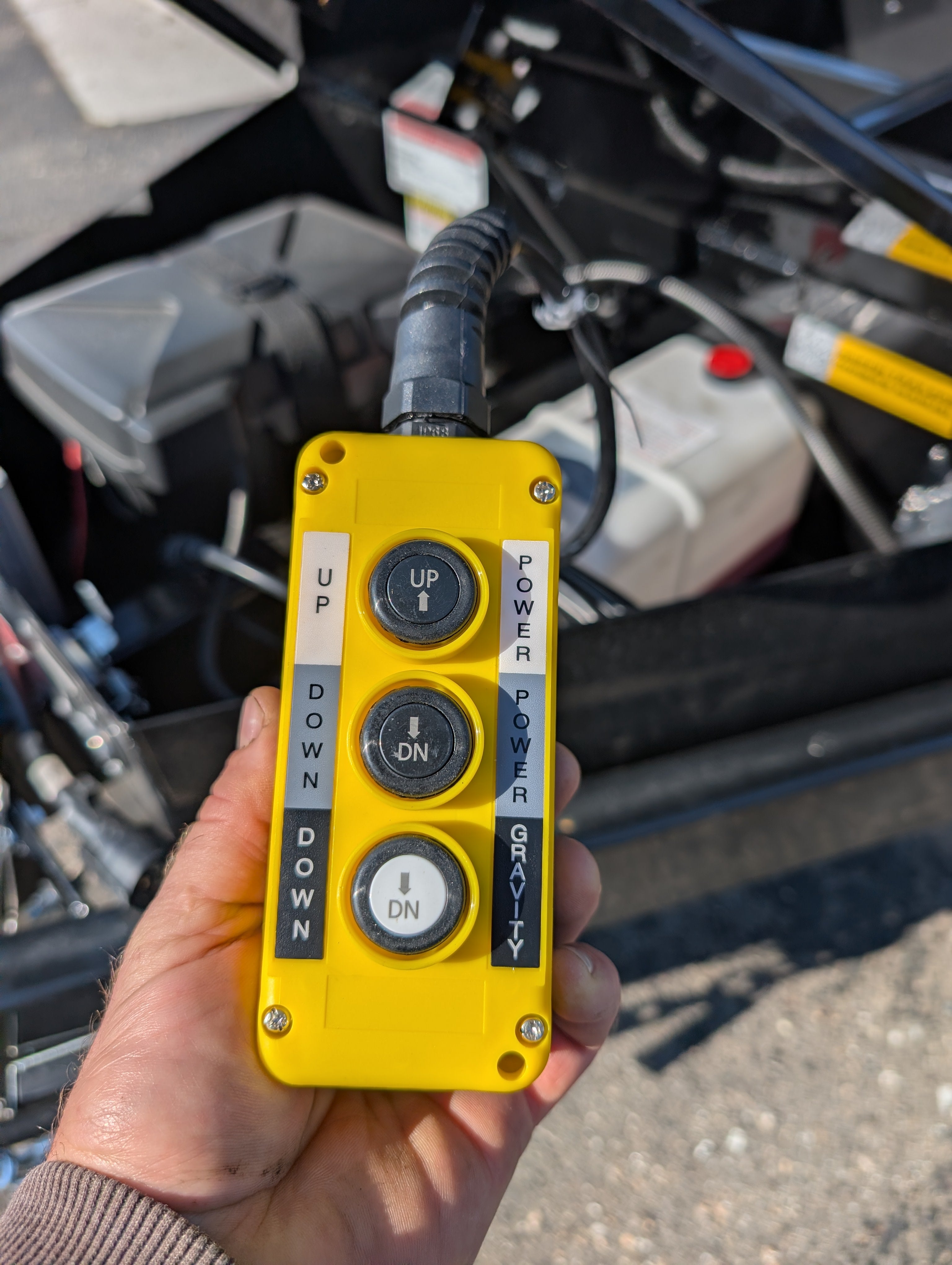 Telescopic Lift (Standard + Telescopic & 16K Heavy Duty configurations) — A single multi-stage cylinder mounted at the front pushes the bed to a full 45-degree dump angle — significantly steeper than dual ram. The steeper angle means sticky materials like wet clay, compacted dirt, and heavy gravel clear the bed completely instead of clinging to the floor. The front-mounted position puts 100% of the payload behind the lifting point, delivering more direct lifting force with less stress on the trailer frame. Telescopic is power up, gravity down — the bed lowers under its own weight, which means faster cycle times and more dumps per battery charge. This is the same lift technology used on commercial semi-end dump trailers and heavy-duty dump trucks.