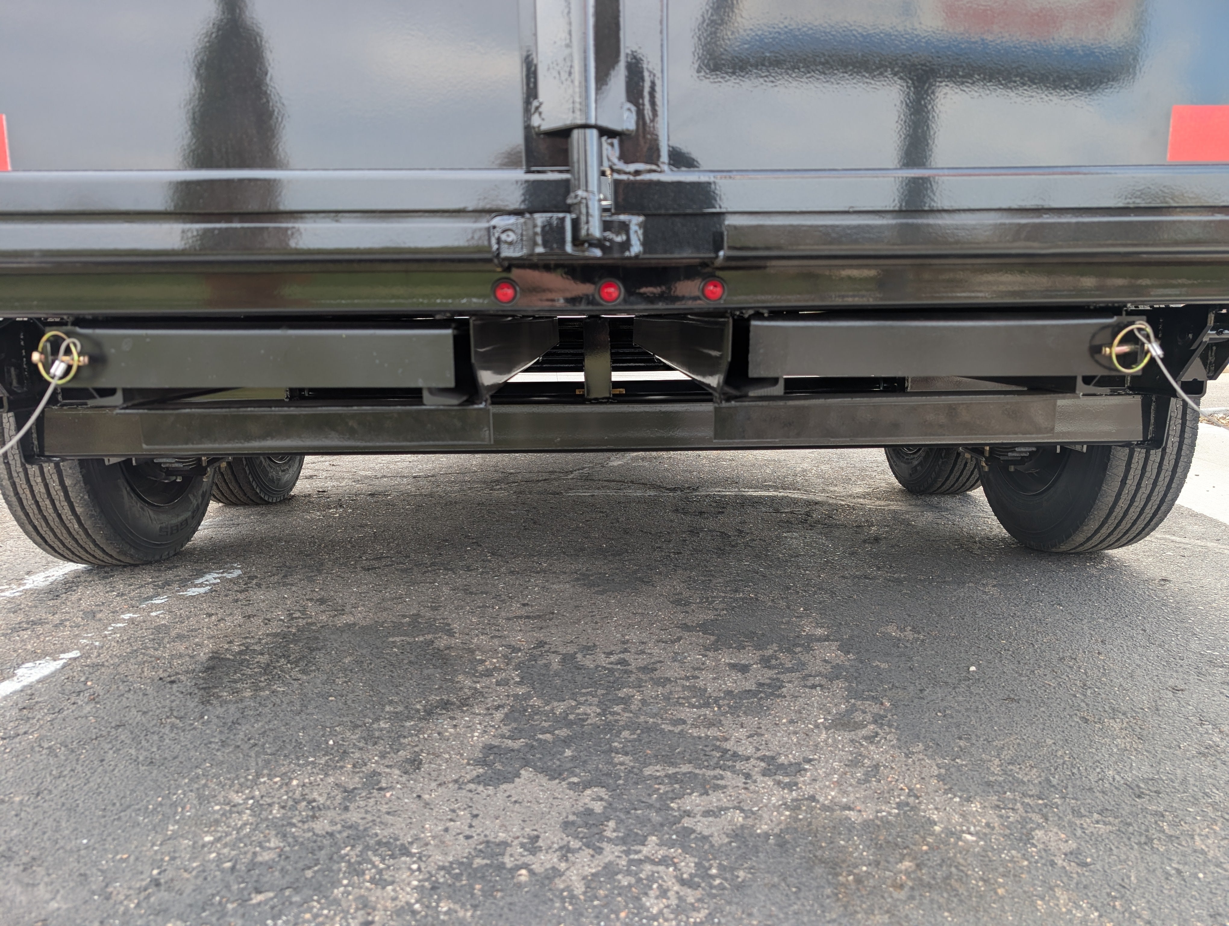 Dual Ram Lift (Econo & Standard configurations) — Two hydraulic cylinders mounted under the bed lift in tandem. The dual ram system is power up and power down, giving you full control over descent speed. That matters when you need to stop mid-dump, feather a partial load, or carefully lower equipment onto the bed. The two-point lift spreads force evenly for stable, predictable operation. Dual ram is the industry standard for general-purpose hauling — dirt, gravel, mulch, firewood, and debris.